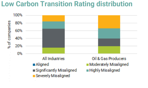 In fact, 60% of the companies in the oil and gas producer industry are currently categorized as Severely Misaligned or Highly Misaligned to meet future net zero targets.