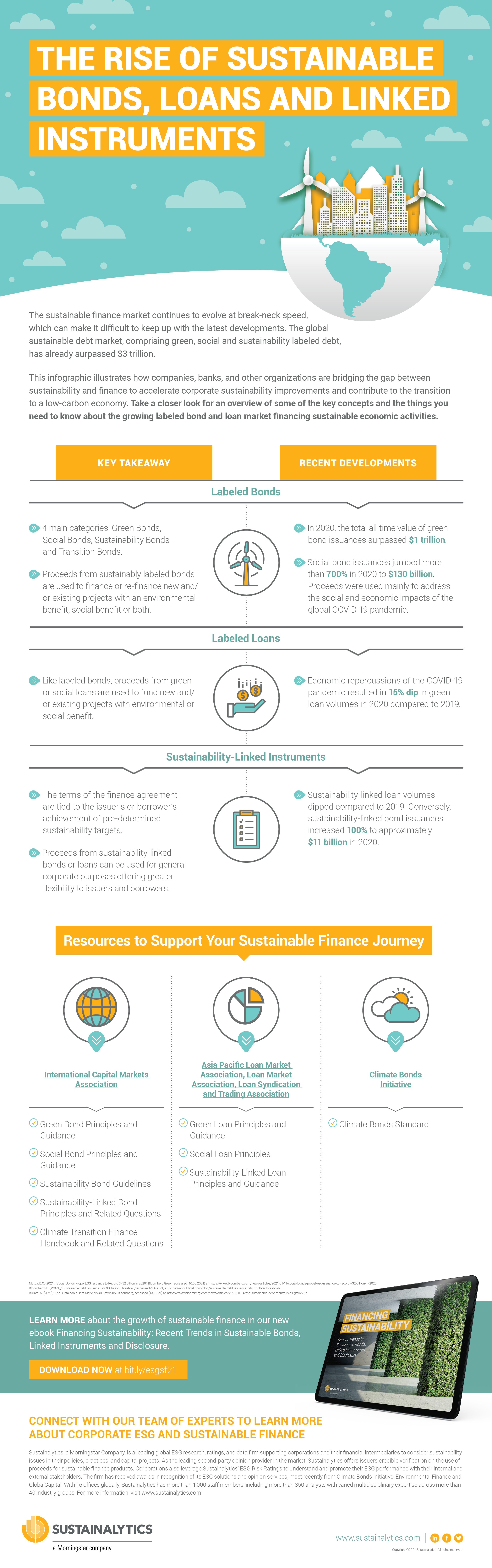 The global sustainable debt market has surpassed US$3 trillion in issuances and continues to evolve at break-neck speed. For issuers, corporate borrowers and banks, it can be hard to keep up. To help bring you up to speed on what’s happening in the market, we’ve published an ebook and created the infographic below highlighting key concepts and recent market developments.