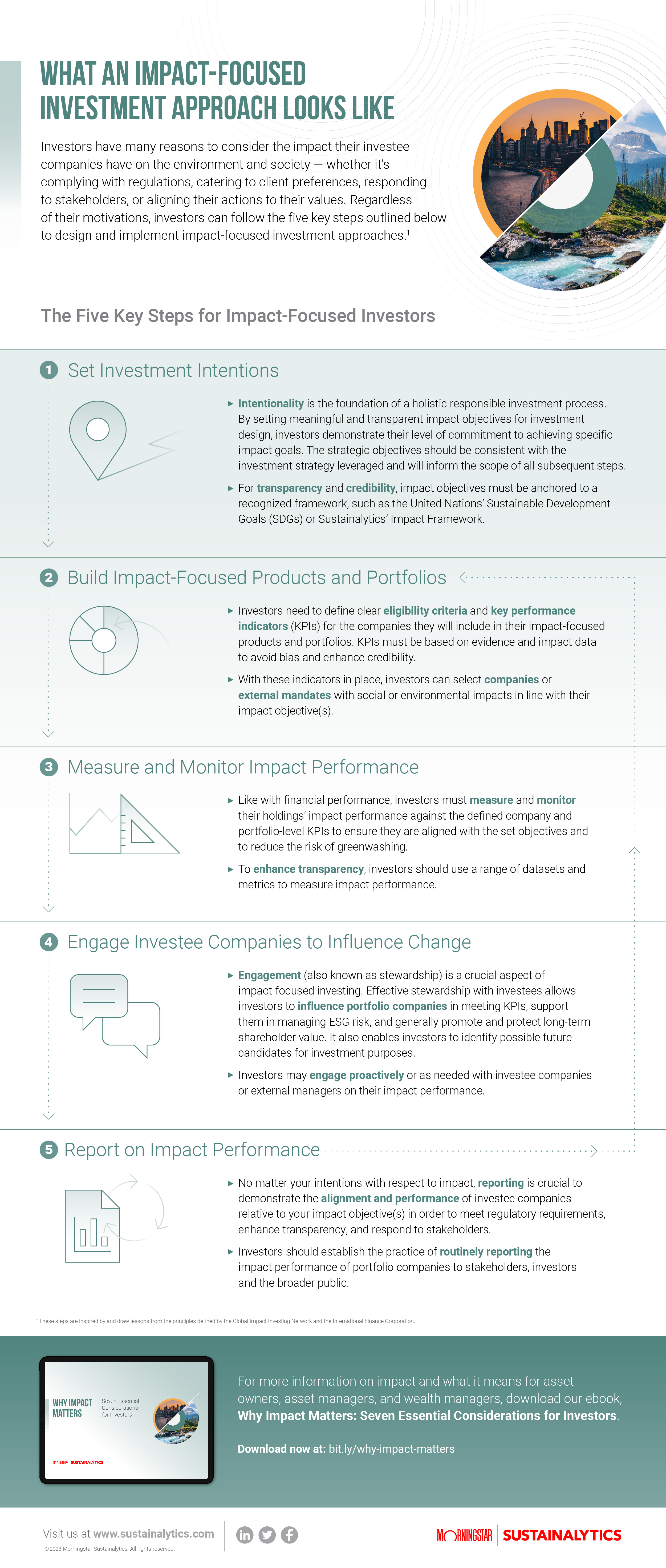 Regardless of their motivations, investors can follow the five key steps outlined in our infographic below to design and implement impact-focused investment approaches. These are inspired and draw lessons from principles defined by the Global Impact Investing Network and the International Finance Corporation.