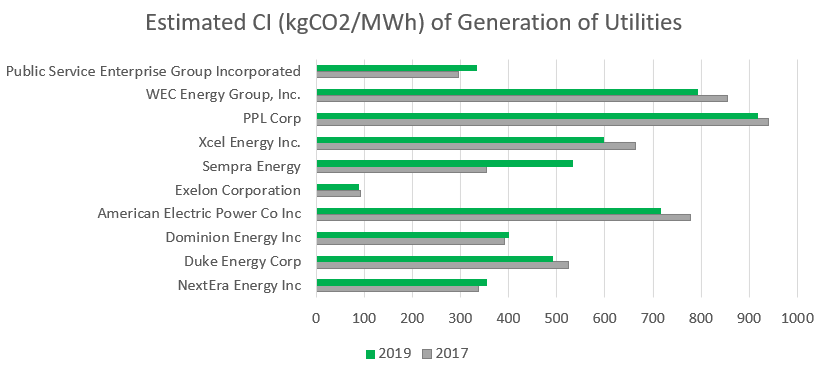 The ten largest utility companies by market capitalization in the country, where relevant data was available, have recorded noticeable changes in their carbon intensity between 2017 and 2019. The general trend indicates that majority of the companies have recorded a change in their CI of generation.