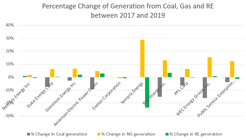 The uptake of renewable asset ownership of Utilities between 2017 and 2019 is fairly limited. Incidentally, Sempra Energy sold its significant renewable portfolio. As of 2020, natural gas comprises over 80 percent of its existing portfolio, resulting in a significantly higher CI of Generation in 2019 compared to 2017. NextEra – one of few companies in the list above to record an increase in coal-powered generation – acquired Gulf Energy’s coal assets, resulting in generation from coal going up by one percent in 2019, compared to 2017. PSEG saw a seven percent decrease in its nuclear generation and a twelve percent increase in its share of Natural Gas-based generation in the same period. As a result, while the three companies recorded an increase in their CI of Generation, it is not attributed to the addition of newly built coal plants or a significant increase in generation from their existing ones.