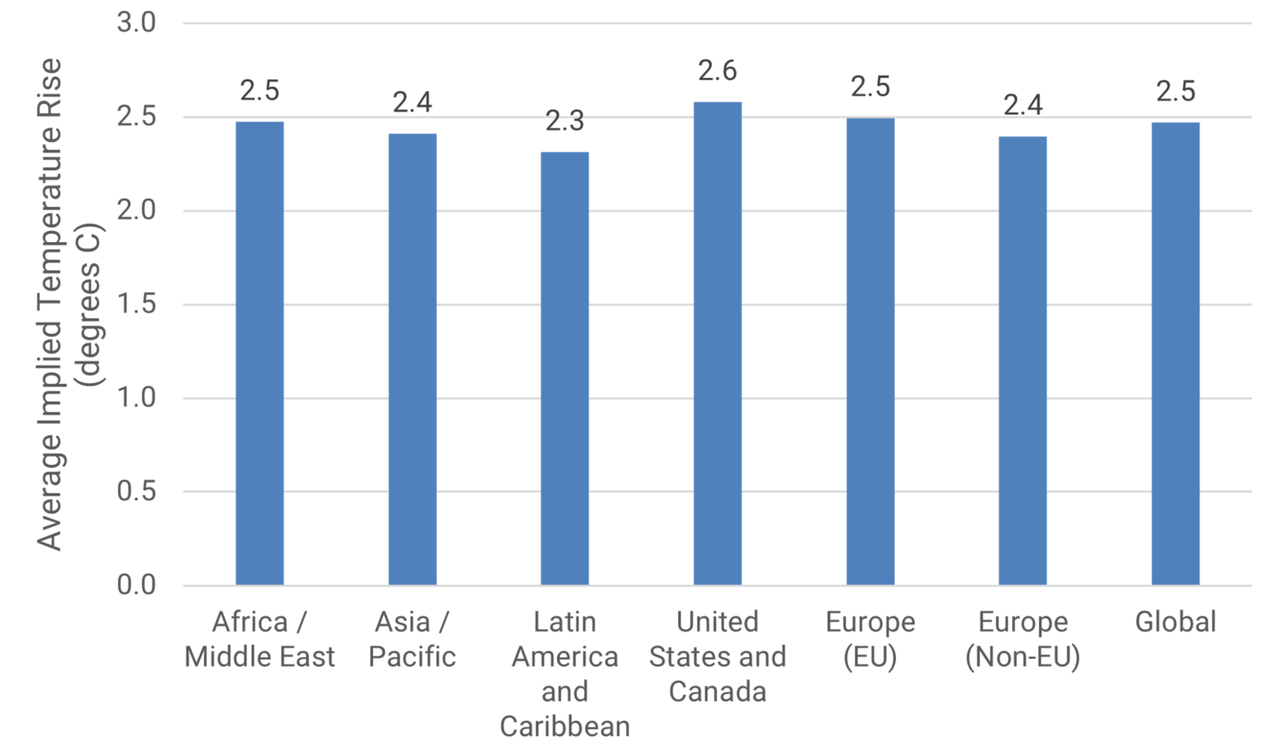 Looking at the performance ITR metric for EU companies, Figure 3 shows that the average is 2.5 degrees, significantly above the 1.5-degree target temperature rise, and aligning with the global average which is 2.5 degrees.