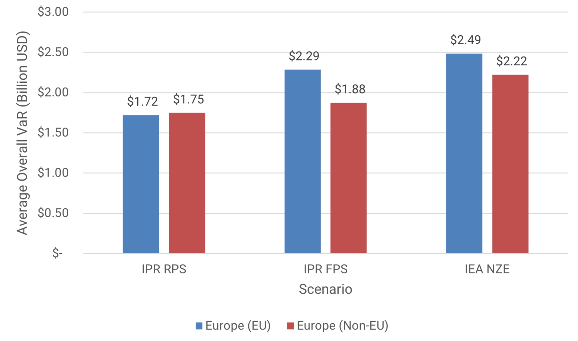 Analysis of the VaR signal shows a similar outcome of decarbonization misalignment among EU companies. The significant misalignment with EU climate ambitions results in an average transition VaR of USD 1.9 billion (EUR 1.67 billion), using assumptions from an orderly decarbonization scenario (IPR RPS). As Figures 4 and 5 illustrate, the results are significantly higher if using assumptions from the IEA’s Net Zero by 20506 scenario or a disorderly transition scenario (IPR’s Forecast Policy Scenario).7