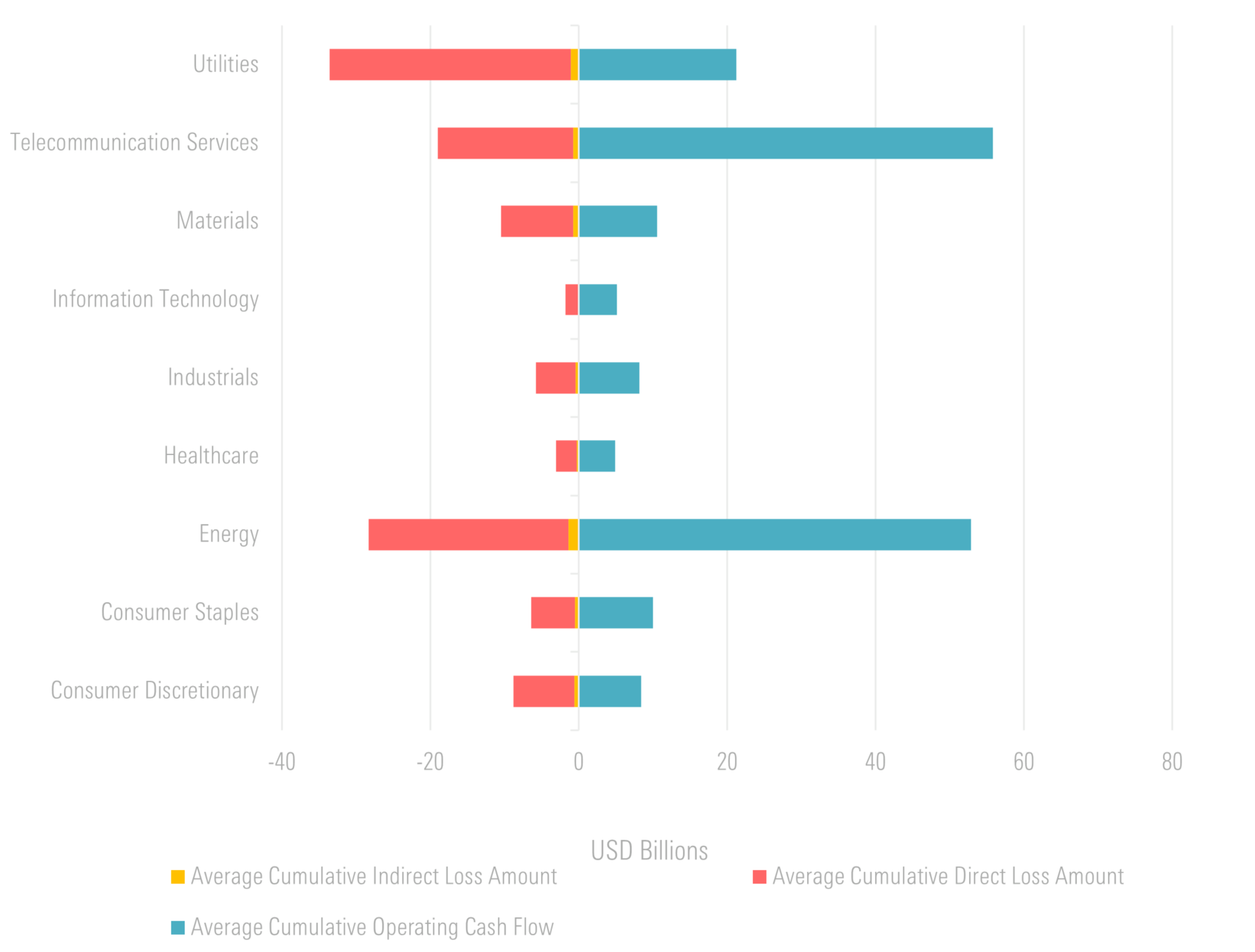 In a hot house world scenario, the average company in Morningstar Sustainalytics’ Physical Climate Risk Metrics universe is expected to lose an equivalent 4.3% of cumulative operating cash flow due to these direct and indirect risks, between now and 2050. The same dataset reveals significant variation between companies, as well as between sectors, depending on their locations, regional revenue, and asset values.