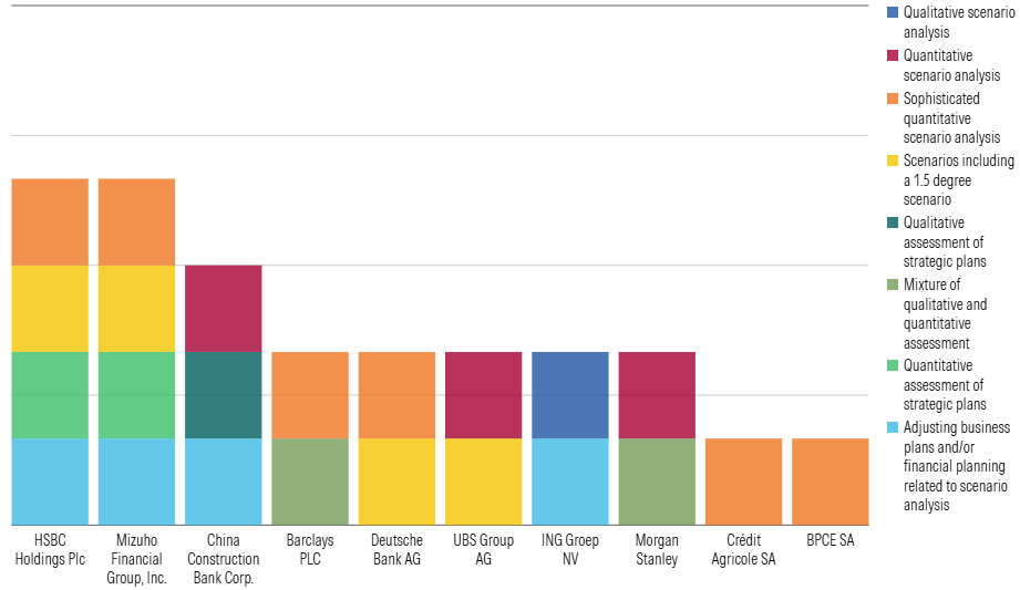 Additionally, EU banks are expected to integrate climate risks, among other ESG risks, into their internal liquidity adequacy assessment process (ILAAP), which is used internally to identify, measure, and manage liquidity adequacy under adverse scenarios.3 Based on corporate disclosure, eight out of the 29 G-SIBs use outcomes of their climate scenario analysis to inform their internal liquidity adequacy planning. Best-in-class peers include Deutsche Bank and BPCE, which conduct ad hoc climate stress analysis to reflect the impact of climate risk drivers on liquidity flows.