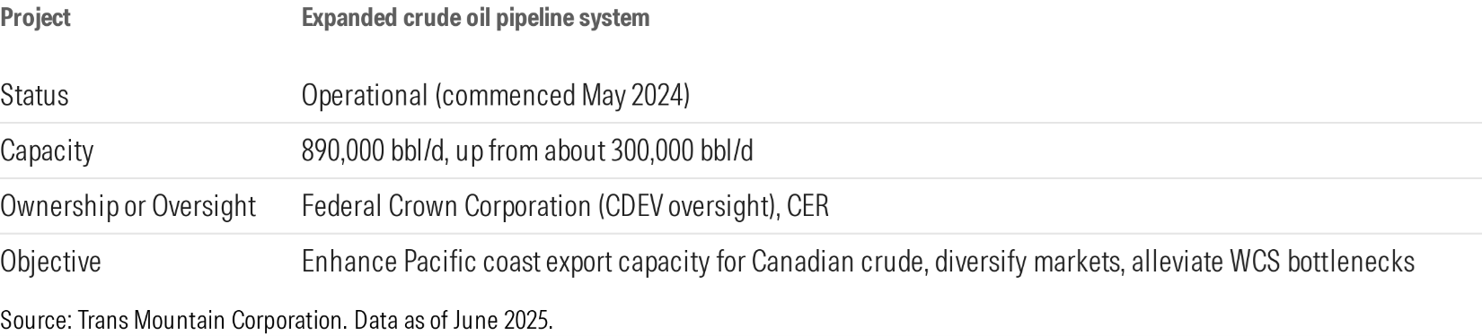 TMX is a game changer for market access. It allows Canadian producers to significantly diversify their customer base beyond the traditional reliance on the United States, with Asia emerging as a key destination. This access to the Pacific coast has helped narrow the price discount historically applied to Western Canadian Select heavy crude, or WCS, and alleviate long-standing transportation bottlenecks out of Western Canada.4 However, TMX potentially facilitates increased oil sands production, enabling substantial downstream scope 3 emissions globally when the oil is combusted.5 Meanwhile, the estimated upstream emissions associated with this production are between 13.5 million and 17 million metric tons of carbon dioxide equivalent per year.6 The federal government also faces the challenge of selling this high-cost asset.7 Furthermore, Trans Mountain is now exploring potential projects to further increase this capacity in the coming years.8