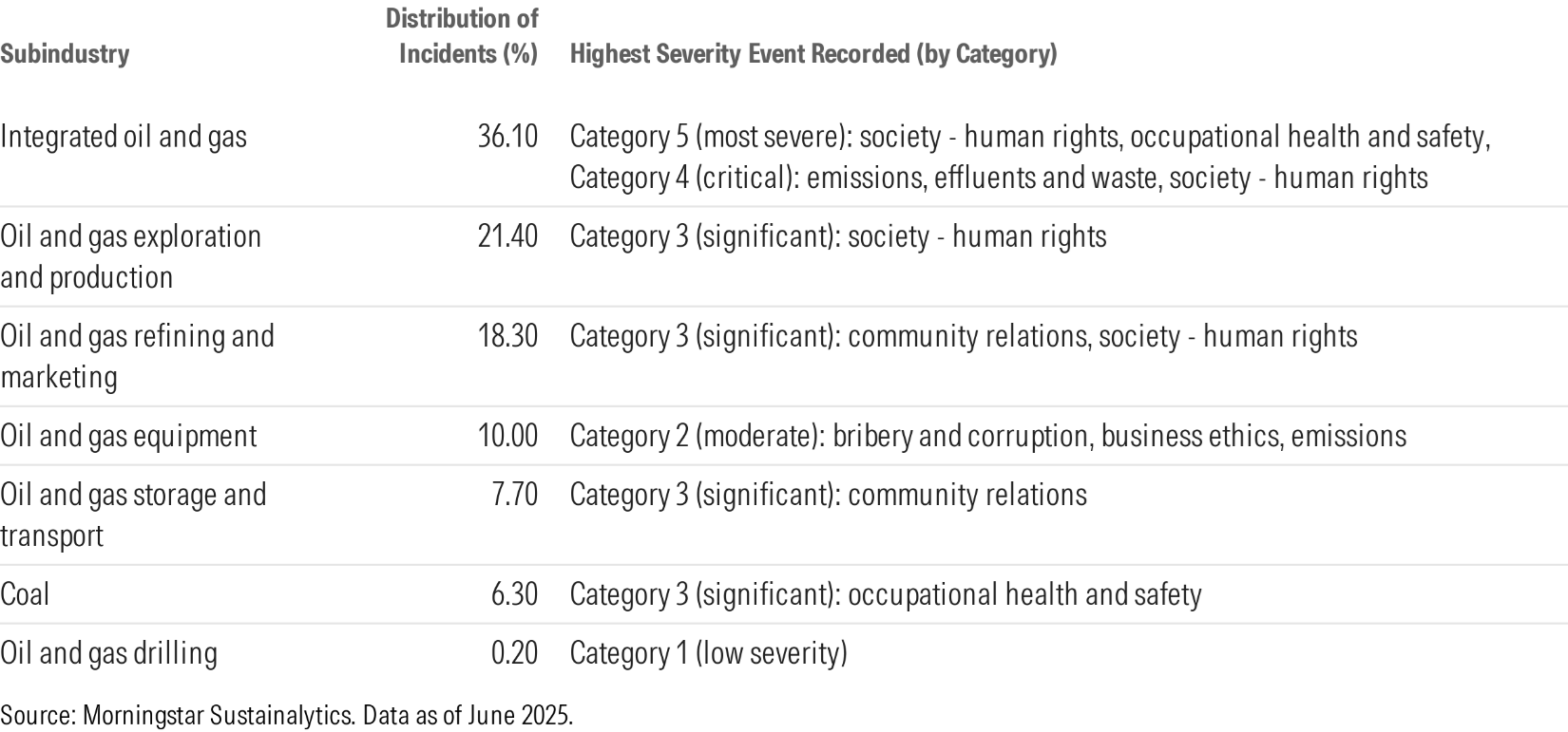 A deeper review of Sustainalytics’ controversy data (179 companies in the energy sector) provides a clearer picture of the risk landscape across energy subindustries.