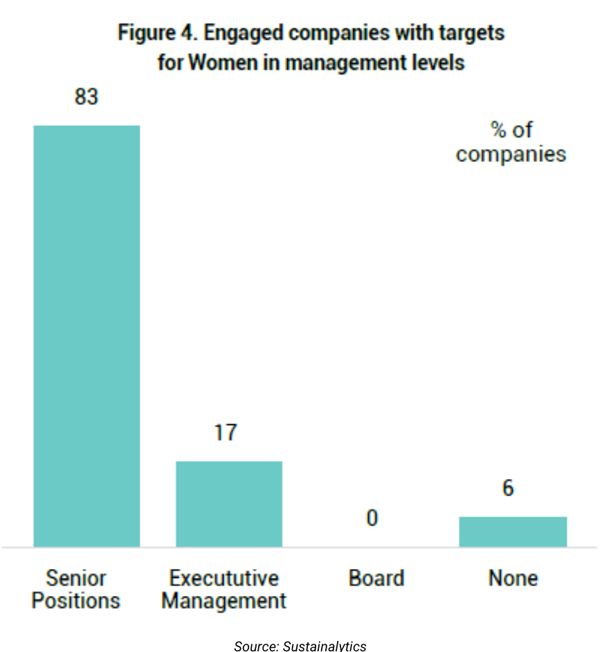 Our engagements are focused on programmes and targets to increase the percentage of women on the board, executive management, and senior positions. Among the companies Sustainalytics has begun engagement dialogues with, 83% answered that they have a target to increase the percentage of female employees in senior positions. Comparatively, 17% have a target for executive management, and none have a target for the board (Figure 4).