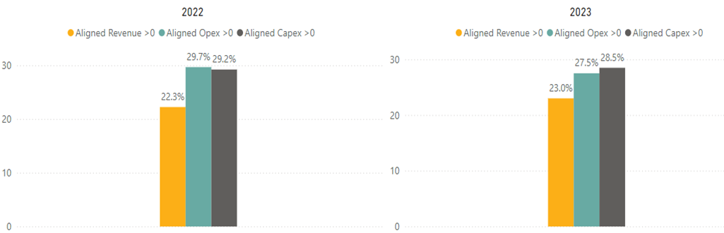Alignment levels are expected to increase next year, when alignment reporting on the four new environmental objectives of the taxonomy (i.e., circular economy, pollution prevention, biodiversity protection, and water and marine resources) becomes mandatory.
