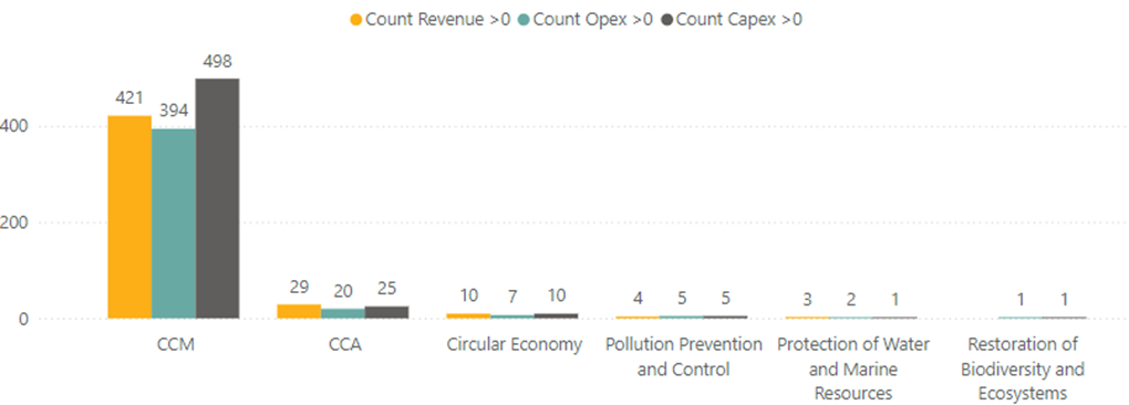 Analyzing the EU Taxonomy objectives that are reported on most by companies, we can see that climate change mitigation (CCM) remains the overwhelming focus. For 2023, out of 744 companies reporting on CCM, 498 reported above-zero alignment.