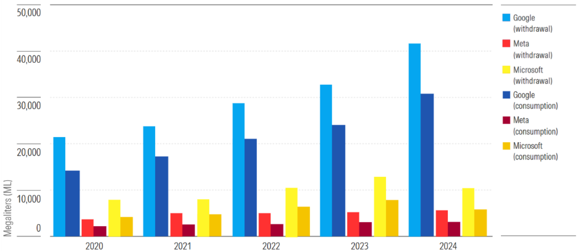Figure 1. Google, Meta, Microsoft: 5-Year Trend in Annual Water Withdrawal and Consumption (in Megaliters)
