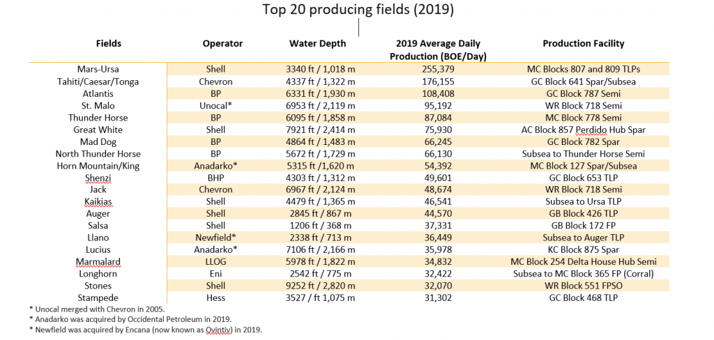 The US Gulf of Mexico has witnessed more than 200 deepwater discoveries in the last 50 years, including Shell’s Tobago field, discovered at a record depth of 9,373 ft (2,857 m).[vi] In FY2019, the top three producing oil and gas fields had a daily production rate averaging more than 100,000 barrels of oil equivalent; many others were produced from ultra-deepwater areas (>5,000 ft / 1,524 m).[v]