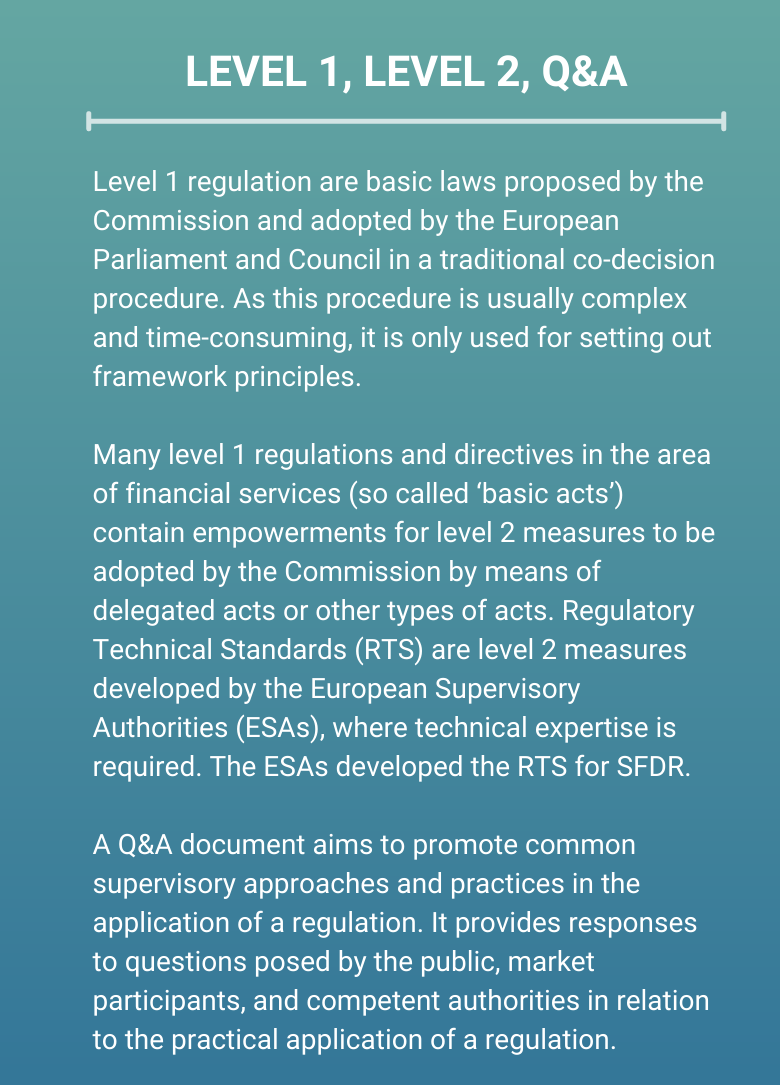Since the publication of the European Commission’s new sustainable finance strategy, the reports on further Taxonomy developments, and the final rules on Taxonomy reporting for corporates and financial undertakings, two further developments have been announced. On July 9th, the European Supervisory Authorities (ESAs) announced a six-month delay in the implementation of the level 2 regulation, or regulatory technical standards, of the EU Sustainable Finance Disclosure Regulation (SFDR). Then, on July 26th, the EU Commission published a long-awaited Q&A on the interpretation of key elements of the Sustainable Finance Disclosure Regulation (SFDR). These new developments will leave many of us with a lot of poolside or bedside reading during the holidays as the Commission and the regulators break for summer. In this blog, we look at the delay of the level 2 regulation, some aspects of the Q&A, and the ongoing confusion and divergence around SFDR. We pay special attention to the potential impact of the Principle Adverse Impact indicators, an element of SFDR.