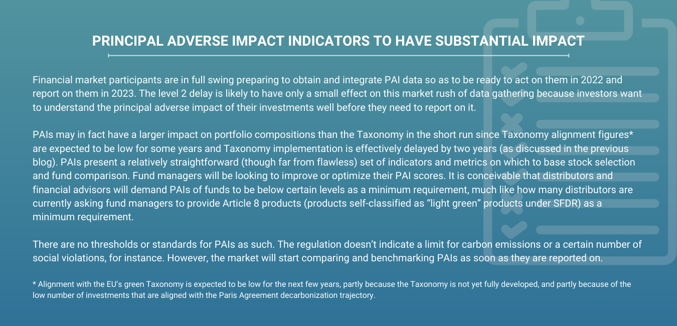 Reporting on Principal Adverse Impact indicators (PAIs) is also part of the level 2 regulation. [i] We assume that this reporting, which is due in June 2023, is also impacted by this delay, however, it is not yet clear exactly how. Despite the shifting timelines, we believe that the market momentum around PAIs will not diminish and that PAIs may have a significant impact on stock selection and portfolio construction by fund managers keen to have “good” PAI scores (see second breakout).