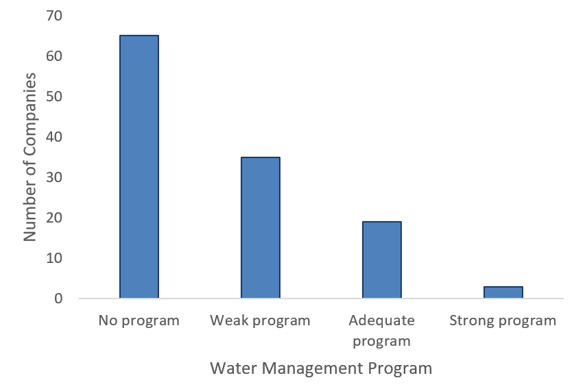 Nearly half of companies disclosed elements of a formal water management program (Fig. 3); of those that had disclosure, 61% were rated as having a weak program, 33% an adequate program and 5% a strong program. This management indicator assesses factors such as whether a company has initiatives to reduce freshwater use, water reduction targets and deadlines, and monitors and measures their water use. The majority of companies (84%) did not disclose the necessary data (such as water withdrawal or water consumption) to calculate their water intensity; as a result, it was not possible to calculate and benchmark their water intensity against peers.