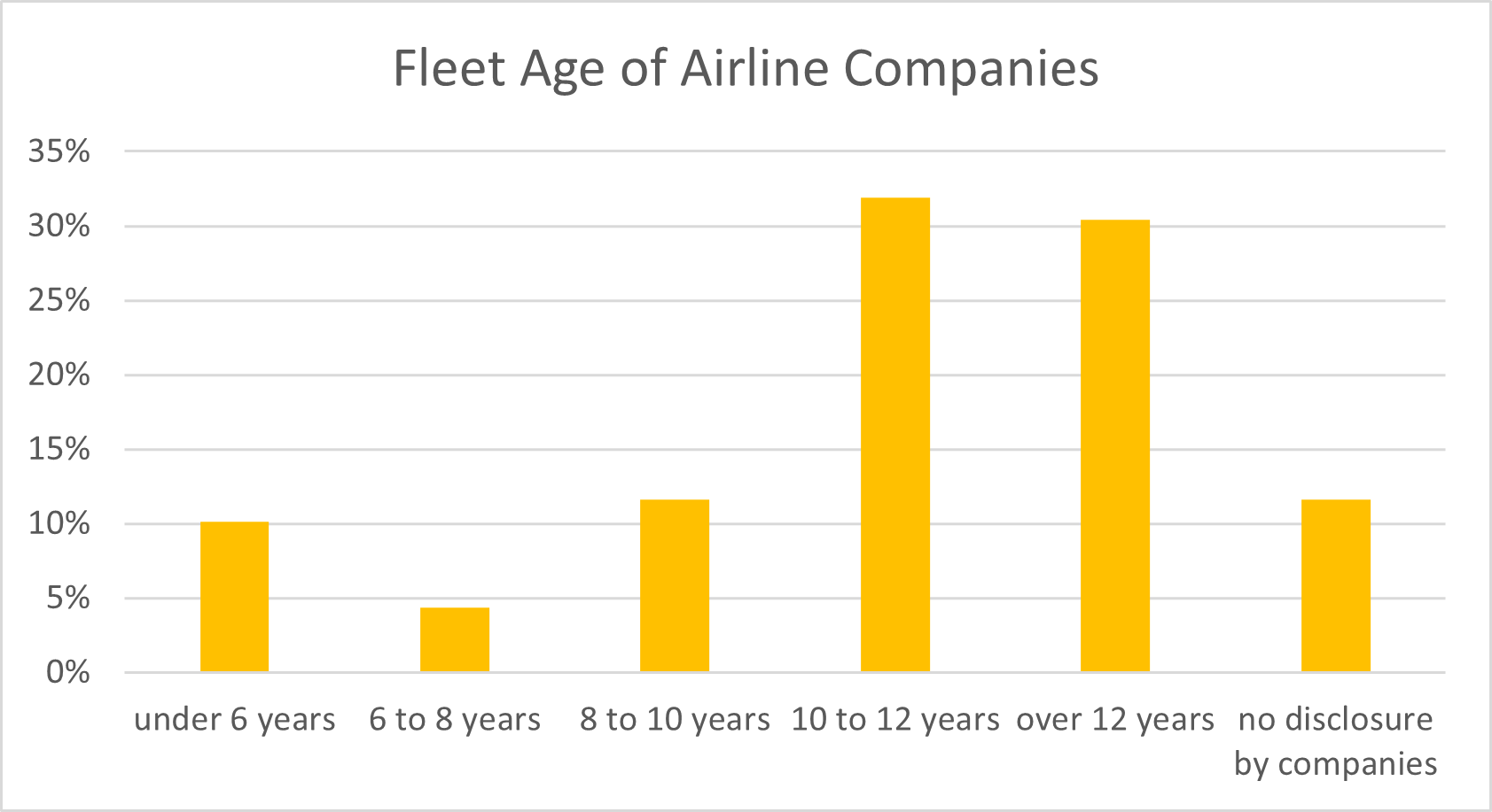 Adding to the difficulties of an industry already battered by the pandemic, the increase in jet fuel prices as a direct consequence of the war1 adds a bleak prospect to the recovery of airlines, which are already highly indebted as of 2022. To minimize the impacts on financial sustainability, airlines will be obliged to pass on some of these costs to their customers, which may in turn, impact customer demand in the current inflationary context. Fuel efficiency is now more essential than ever for the sector, with airlines operating older, less fuel-efficient fleets likely to be more impacted. Sixty-two percent of airlines operate fleets older than ten years, according to Sustainalytics data. (See Exhibit 1)