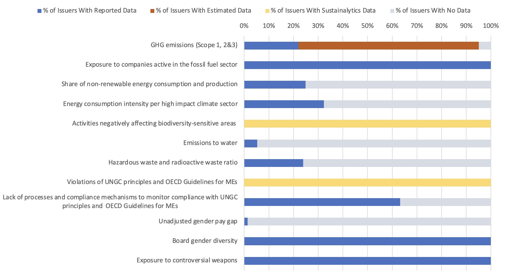 An analysis conducted by Morningstar Sustainalytics shows that there are still substantial gaps in data availability to meet the reporting requirements outlined in the SFDR. Relying solely on corporate disclosures will not be enough to meet these requirements. The European Commission allows, however, for the use of estimated and third-party data to fill these gaps. Although generally there is ample data for metrics that have been traditionally included in sustainability reporting, such as greenhouse gas emissions, there is still limited data for less commonly used metrics, such as emissions to water.