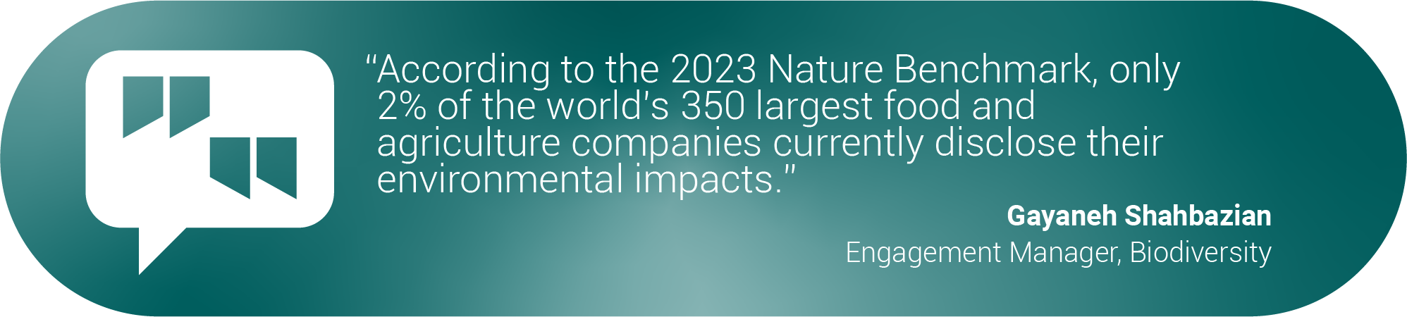 Despite this risk, most companies have yet to identify and understand the magnitude of their impact and dependencies on nature along their value chain. According to the 2023 Nature Benchmark, only 2% of the world’s 350 largest food and agriculture companies currently disclose their environmental impacts.4