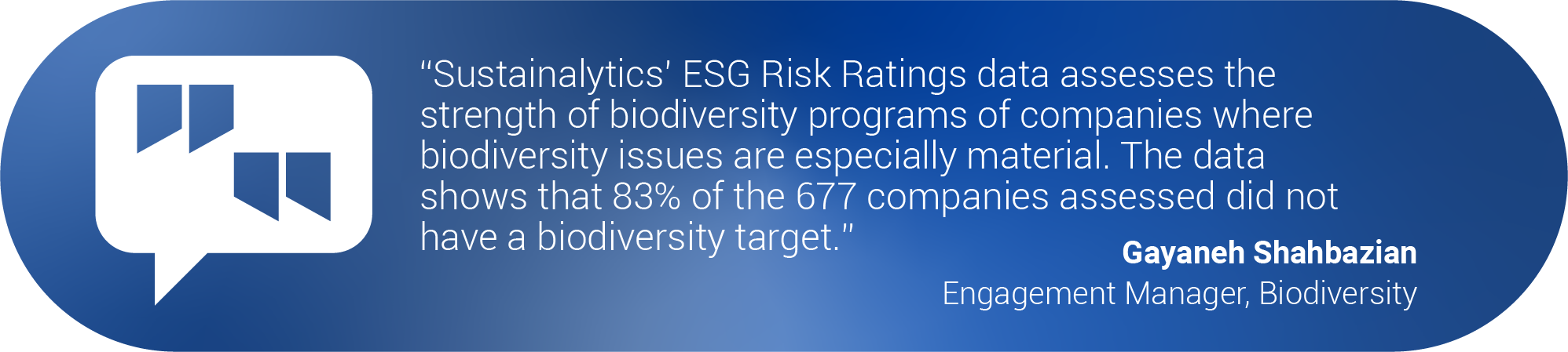 The SBTN resources come at a critical time, as very few companies have made progress in target setting. Sustainalytics’ ESG Risk Ratings data assesses the strength of biodiversity programs of companies where biodiversity issues are especially material.