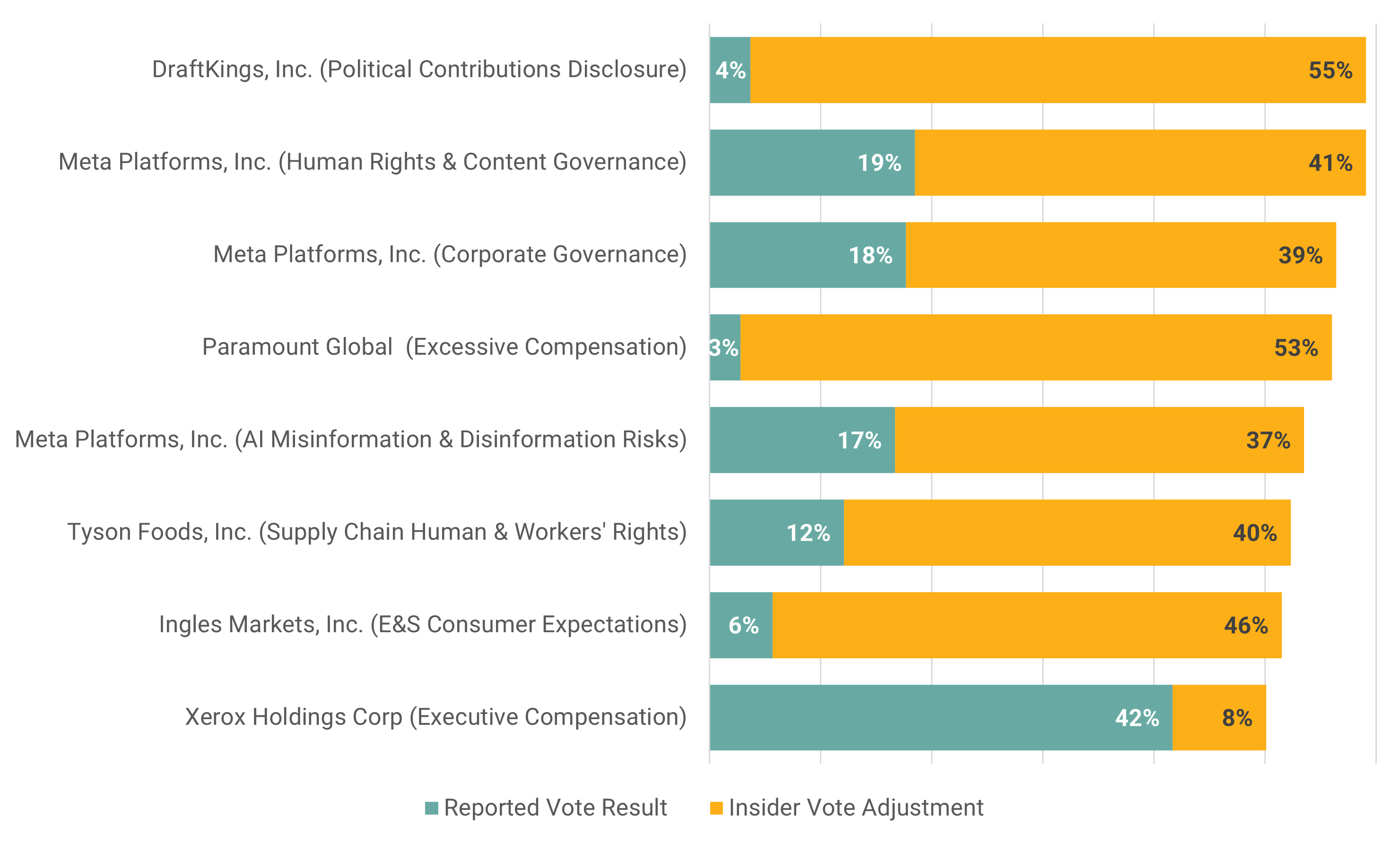 - Shareholder resolutions at companies with dual class structures faced a significant impact from insiders, effectively swaying votes by an estimated 19 percentage points across 47 proposals.