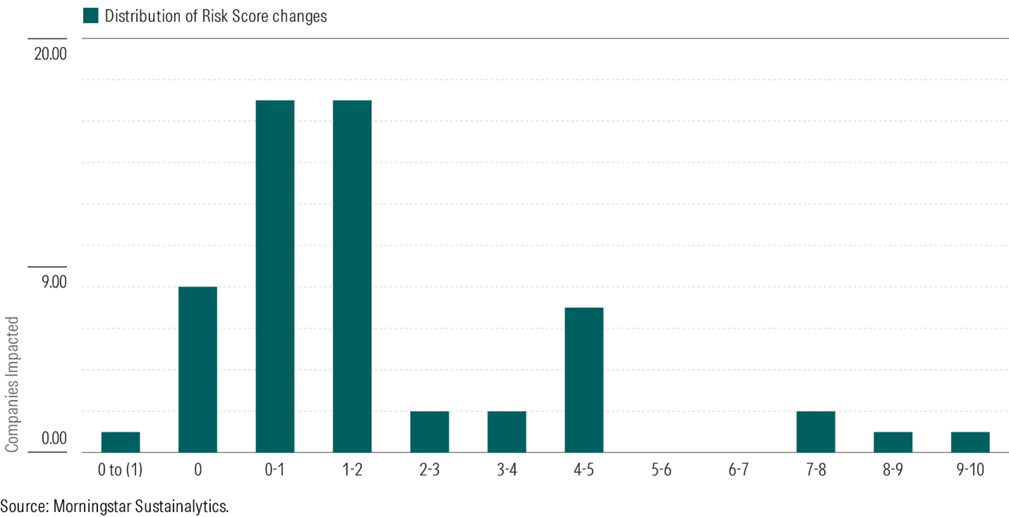 - The average change in our ESG Risk Rating score for 75% of the firms tested was less than 2 points.
