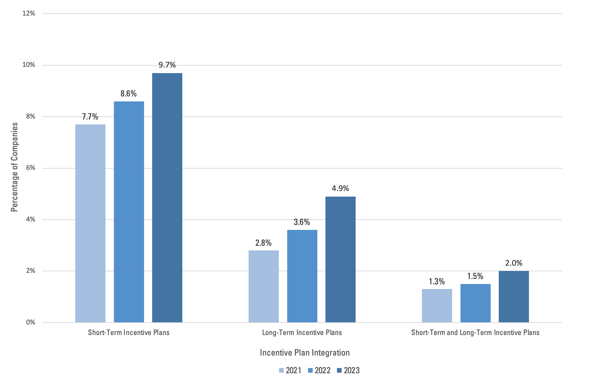 Across sectors, companies crossed a critical threshold in integrating environmental, social, and governance (ESG) metrics into their executive incentive plans – the share of publicly traded companies embedding climate metrics into their executives’ compensation plans more than doubled over the past two years.1 But while this practice is gaining momentum, some still worry that these incentives are not based on quantifiable targets, making it difficult to determine if they are really having the impact investors expect.