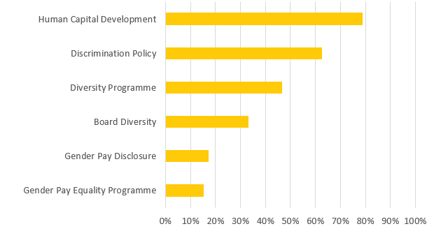 Despite meaningful progress in recent years, there is still significant divergence in company performance on various diversity indicators. Exhibit 2 shows differences in the proportion of researched companies that demonstrate strong management of select human capital indicators.[v] Nearly 80%of companies have a robust Human Capital Development Program and more than 60% of companies have a strong Anti-Discrimination Policy. That said, less than 20%of companies have strong initiatives to ensure gender pay equality, such as gender pay auditing and gender pay differential reporting. Research shows that disclosing gender pay data helps to shrink wage gaps, with no negative impact on profitability.[vi]