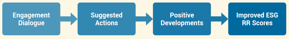 We systematically track engagement outcomes in various ways. First, we track Positive Developments, defined as new initiatives that engaged companies have implemented with reference to our Suggested Actions. These are tangible results improving ESG risk management and/or performance. Second, the Sustainalytics Research Team conducts regular reviews of the ESG Risk Rating, reflecting the changes in the quality of management of material ESG issues.
