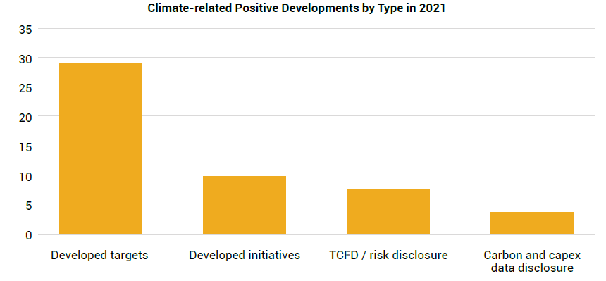 During 2021, 225 Positive Developments were recorded. As shown in the below chart, of the 51 climate-related ones, 29 pertain to developing climate targets, ten on corporate initiatives to address climate change (e.g., energy efficiency programs), eight on the commitment to aligning disclosure with TCFD or enhanced risks disclosure and four on better transparency on carbon emission and capex data.