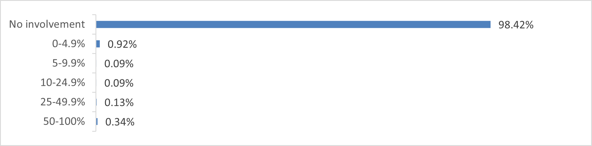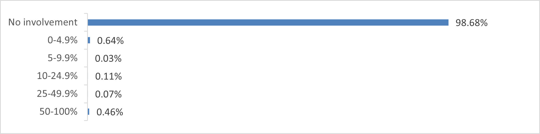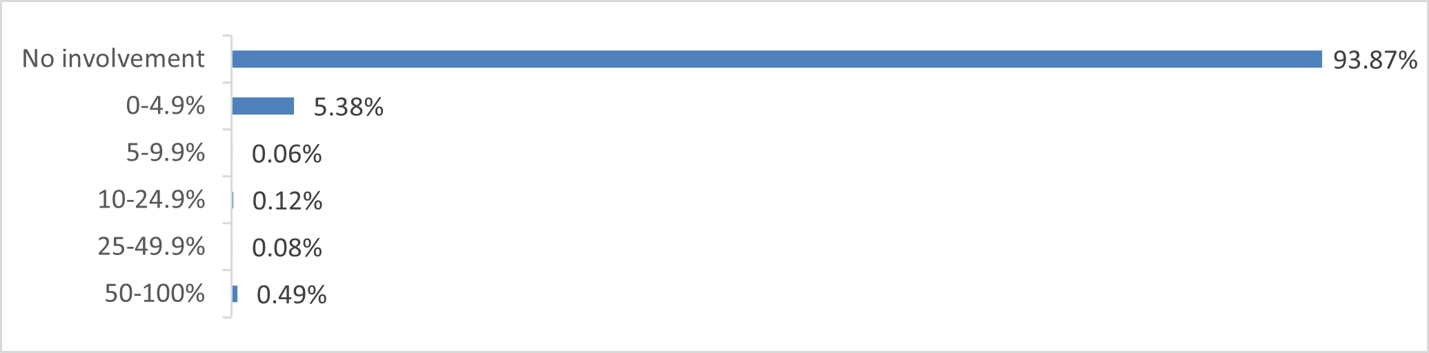 To support investors in their considerations, product involvement research can provide details on how a company is involved in one or more areas, as well as the degree of its involvement. In the figures below, we can see an overview of the percentage of companies from our standard research universe that are involved with, respectively, tobacco (Figure 4), thermal coal extraction (Figure 5) and palm oil (Figure 6), as well as their level of involvement.