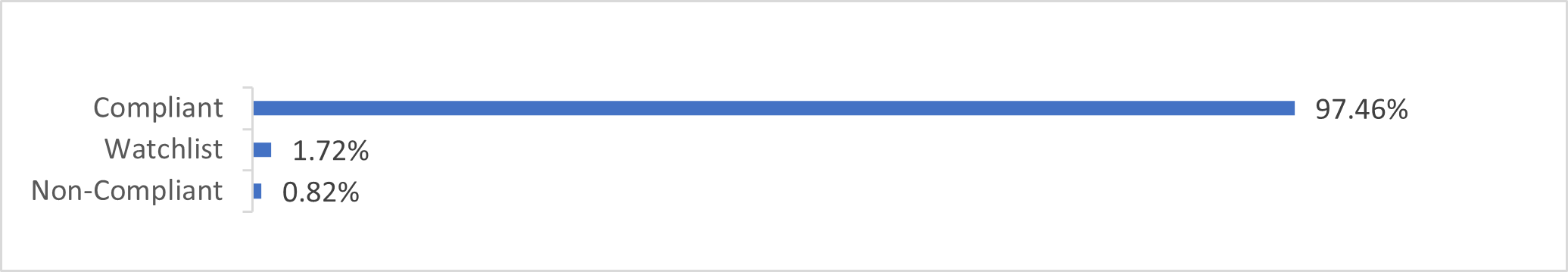 An assessment based on these dimensions can be made to determine if a company’s operations are considered compliant. Companies with a "Watchlist" or "Non-Compliant" status, respectively, are breaching or are at risk of breaching international norms. They are therefore considered to be at high risk of causing or contributing to actual adverse impacts.