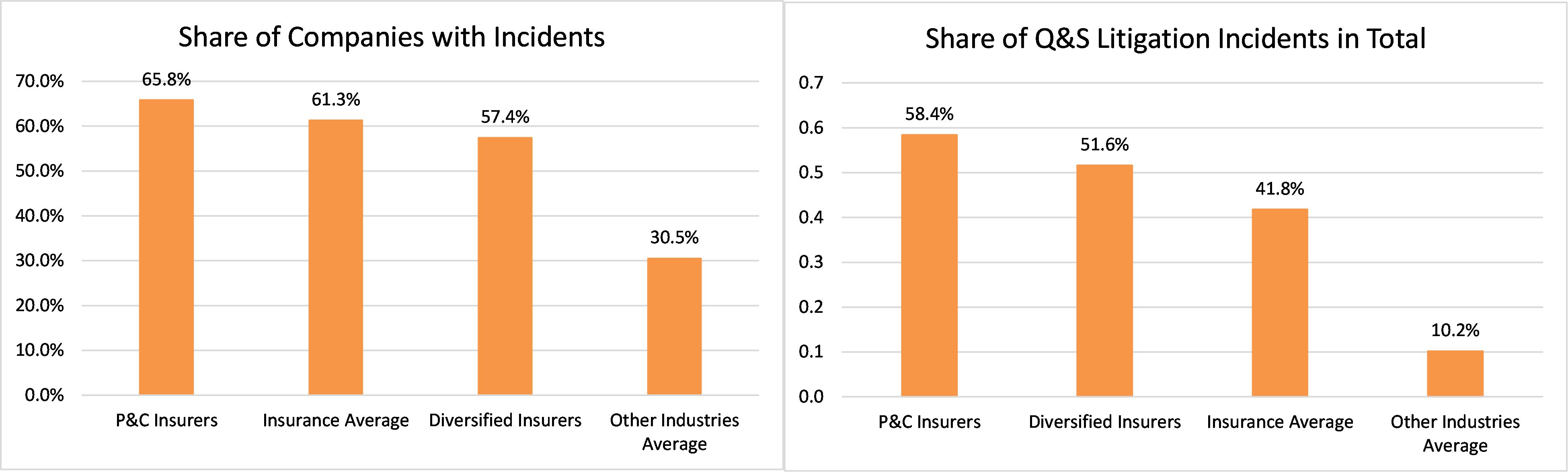 Owing mainly to the frequent disputes between policyholders and underwriters/intermediaries, insurance operations tend to be involved in more litigation incidents than other sectors (61% of insurers have incidents, versus an average of 31% for other sectors). The vast majority of these litigation-driven incidents are naturally related to product quality and safety (Q&S). The insurance industry has by far the highest share of Q&S litigation-related incidents at 42%, versus an average of 10% for other sectors. This figure is even higher for P&C (58%) and diversified (52%) insurers.