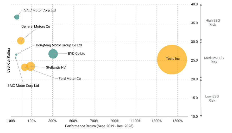 Additionally, no clear relationship emerges between financial performance and ESG risk. Perhaps the only stark differences are those between SAIC Motor and Tesla, as Tesla scores better on both financial and ESG risk.