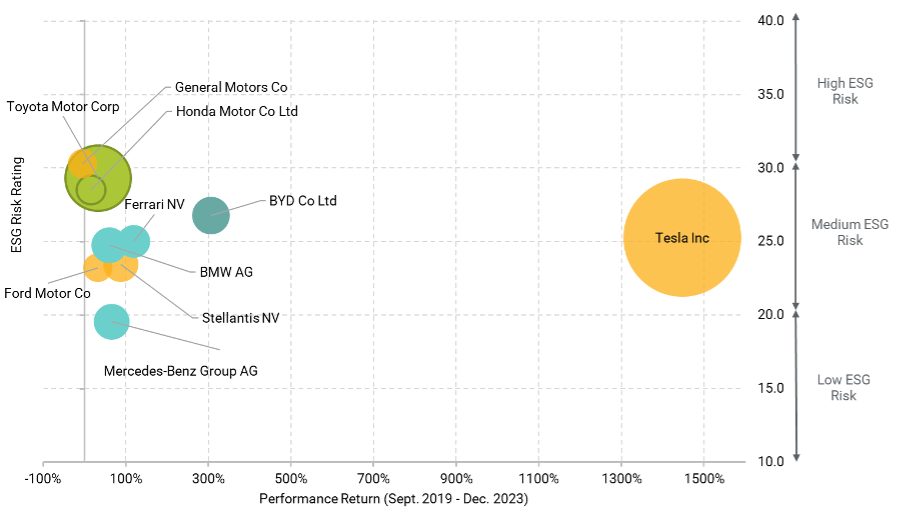 As investors increasingly prioritize ESG performance, it becomes important to explore the dynamic interplay between ESG and financial performance. Figure 1 depicts the financial performance (cumulative returns from January 2021 to December 2023) and the ESG Risk Ratings, as of January 2024, of the major U.S. and Chinese automakers. The size of the dots relates to the size of the companies’ market cap.
