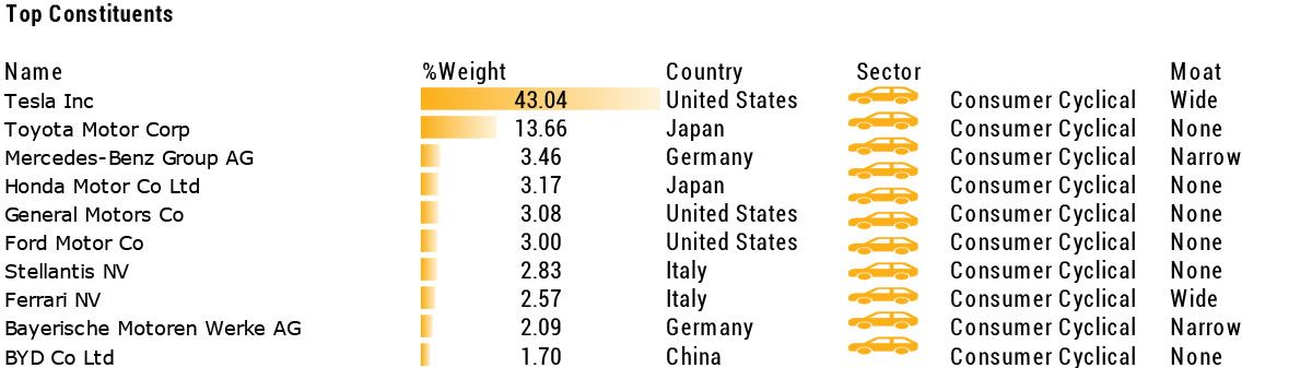 Worldwide, the automobile industry is divided between three big markets: the U.S., China, and the EU. The top 10 constituents of the Morningstar Global Auto Manufacturers GR USD Index (see Table 1) is a geographically diversified group. The total market cap of the index constituents approaches USD 1.5 trillion, highlighting its significant financial importance for investors. Tesla and Toyota are heavyweights in the index, with relative weights (market-cap based) of 43.04% and 13.66%, respectively. Three European companies are on the list: Mercedes-Benz, Ferrari, and BMW. BYD is the only Chinese company included among the top 10.