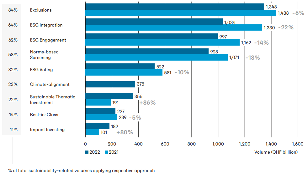 Source: Swiss Sustainable Finance (2023). “Swiss Sustainable Investment Market Study 2023.” For informational purposes only.