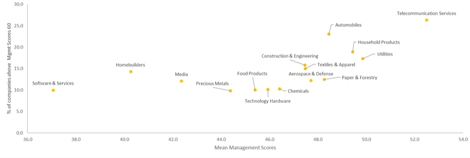 A company with a management score over 60 is categorized as one with strong management of low carbon transition risk. The analysis of companies across our research universe shows that most industries are in the lower range of average management scores (scores between 40 and 50).