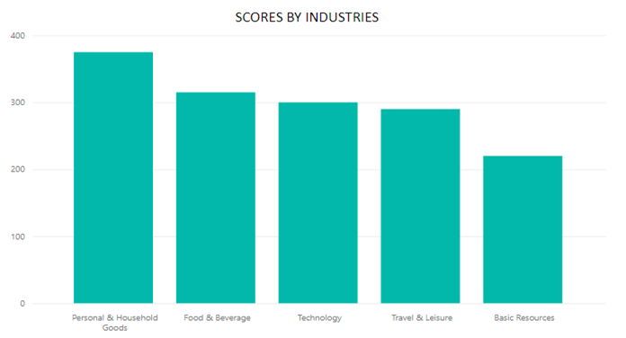 Chart 1 shows how companies are reporting by industry against children’s rights indicators. The Personal & Household Goods industry ranks first, which is expected considering that most of the leading practices are set by this and the Food & Beverage industry. In the benchmark sample, Adidas stands out through its commitment to uphold children’s rights as set out by the UN Convention on the Rights of the Child. The company promotes flexible working arrangements for workers with family responsibilities, recognizes the protection of minors as a material issue, and reports 100% retention rates in 2019 of employees who took parental leave.