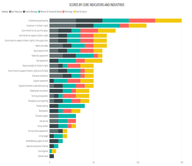 Chart 2 shows how companies are reporting by core indicators and industries. As expected, most companies score well against the “Initiatives and partnerships” indicator, which is considered a lower threshold one due to the commonness of reporting on collaborations with stakeholders such as NGOs on children’s rights. The same applies to the indicator ranked second that focuses on resources donated to social initiatives supporting children’s rights, which is also a widespread practice among companies in most industries. In sharp contrast, companies across industries perform poorly on the core indicators addressing due diligence and parental leave. On the due diligence indicator, only three companies partially scored points against the criteria because most have a process covering human rights without integrating children’s rights into existing assessments. In terms of parental leave, companies typically did not report on the duration and those that did disclose revealed that the leave was less than 14 weeks, for which no score was granted.