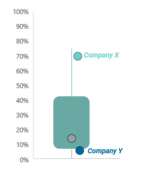 However, other fossil fuel-exposed sectors demonstrate much different results. The utilities sector has a very broad LCT-VaR range, with a low average. This is largely due to the investments in renewable energy made by many utilities companies. Our research demonstrates that Company X has the highest LCT-VaR within the utilities sector (74%) (see Figure 4). Despite this, Company X, a multi-utility, has investments in renewable energy that are expected to reduce its emissions by 20% by 2040. The high LCT-VaR is a result of the company’s emissions reductions being at a much lower rate than required under the IPR RPS, increasing policy exposure, and the potential to pass through costs compared with other utilities companies. Company Y already has a high investment in renewable energy, and while the future investment indicates an increase in renewables that will reduce its emissions by 30%, this is enough to reduce the relative LCT-VaR to 3% between now and 2050.
