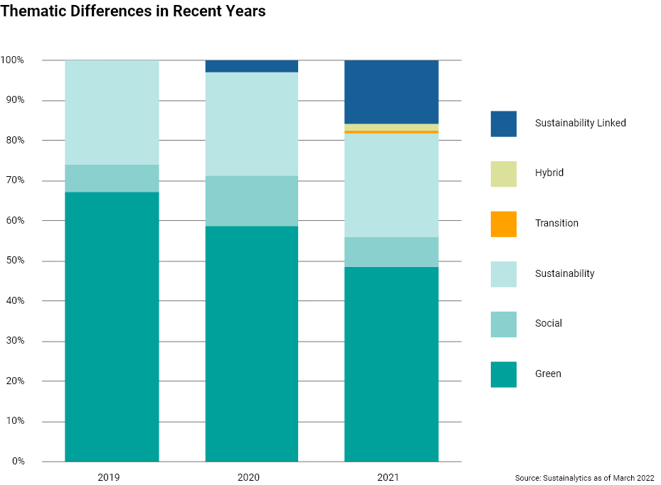 While green bonds continue to lead in terms of total number and volume of deals, we’ve observed a proportional decrease relative to other financial instruments. Notably, the share of Sustainalytics SPOs dedicated to green bonds dropped from 58% to 48% of our total opinions delivered from 2020 to 2021. This trend speaks primarily to the rise in sustainability-linked instruments. That said, in the wake of COP26, we’ve observed increased financing related to net-zero commitments from sovereign and corporate issuers. The regulatory environment continues to evolve, most notably by way of the EU Sustainable Finance Action Plan, whose regulatory measures for financial institutions and corporates will be far-reaching beyond European borders.